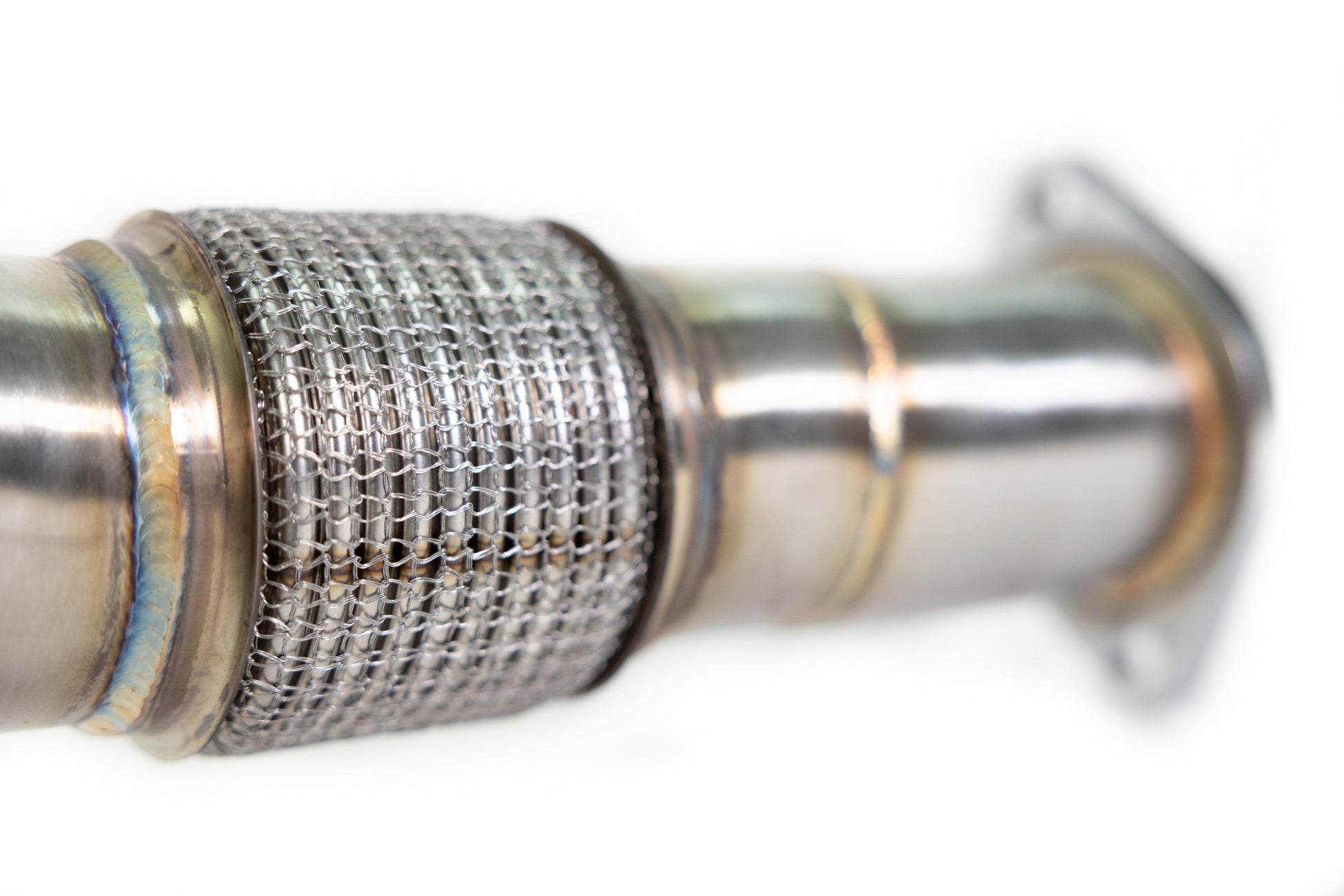 The longer downpipe (front downpipe) in the set utilizes a reinforced flex section. The flex section is incorporated into the long downpipe to relieve stress on the turbo during aggressive driving.